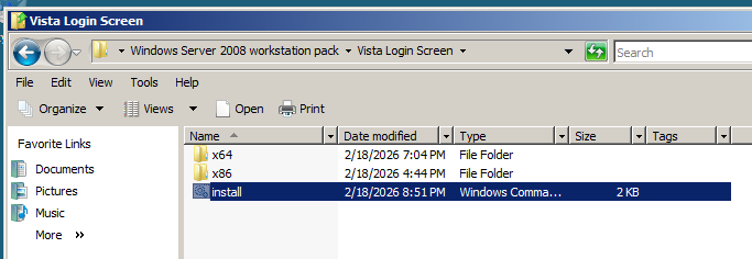 Open the Vista login screen directory and open install.cmd as administrator.