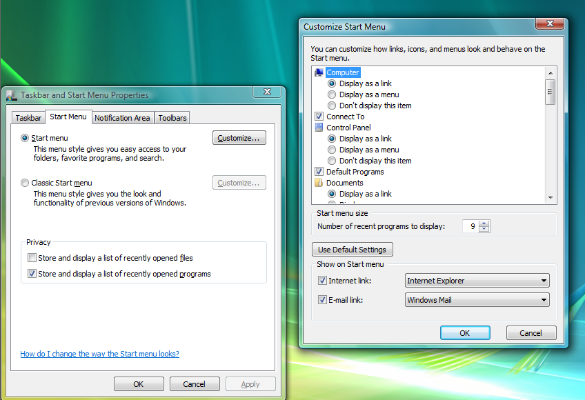 Next, right click on the taskbar and select Properties > Start Menu and configure the following options: