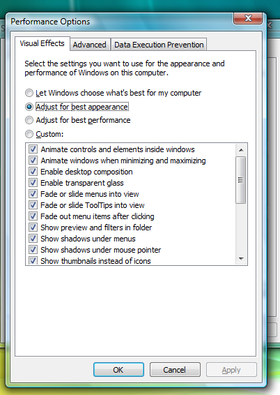 Next, press Win+R or go to the Run option on the Start menu, and type sysdm.cpl. Go to Advanced and click Settings on the first option. Select the option "Adjust for best appearance" and click Apply.